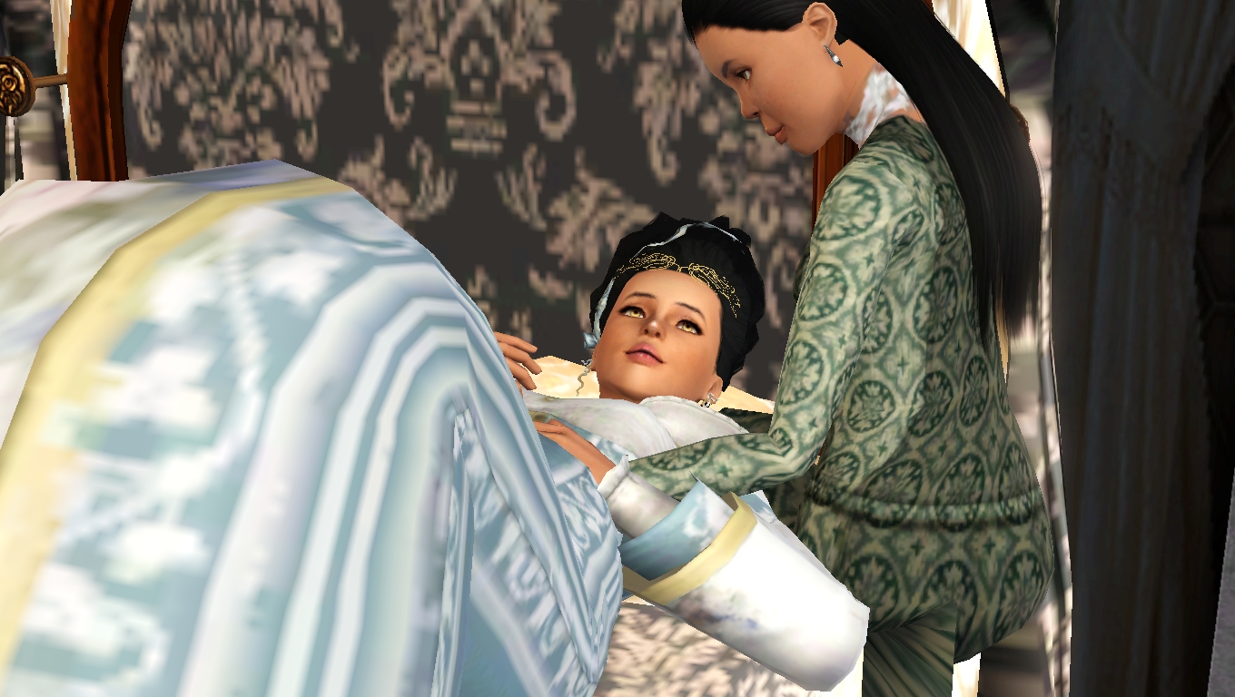 Queen Elmegaard was not well due to her recent discussion with Evelyn and her sorrow of being a betrayed wife. She lied in her bed and was feeling ill. "Mother, I am right here. Are you awake?" Her loving daughter asked. Elmegaard was barely awake, but listened to her daughters voice.