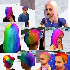 Hi! I just had a colorful idea one day and....surprise! Rainbow hair it is! Included is: Female rainbow long straight hair for all ages (except girl has teddy bear buns) and male rainbow nightlife hair style of all ages (except boy has ricebowl hair) heres some pictures too! Hope this suits your sims!