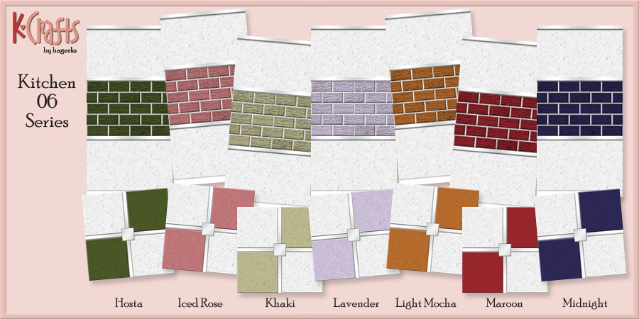 This is KCrafts Kitchen 06 Series with 28 colors. Each includes a wallpaper and linoleum floor. Each will be 7 Simoleons.