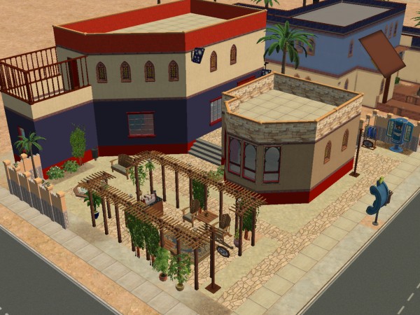 This is one of my community lots from my custom Casablanca neighbourhood. It is for dates and group outings, especially for high creativity sims (because of the jazz band upstairs). : ) But your sims can also do their shopping here (outfits, mobiles), and have a coffee at the open-air café.