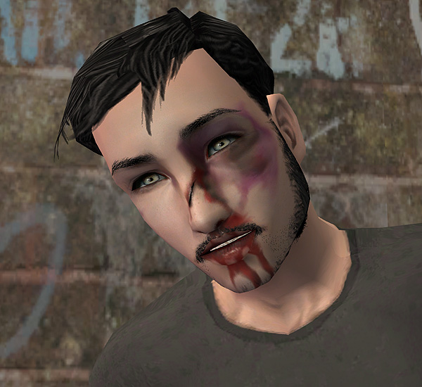 This mask consists of a really, really bad bruise, a broken and bleeding nose, a cut on the bridge, and a few small bruises on the right side of the face. It is wearable with everything except for it's scar - I have also layered it so that eye makeup will (for the most part) layer over it. Wearable with any skintone.
