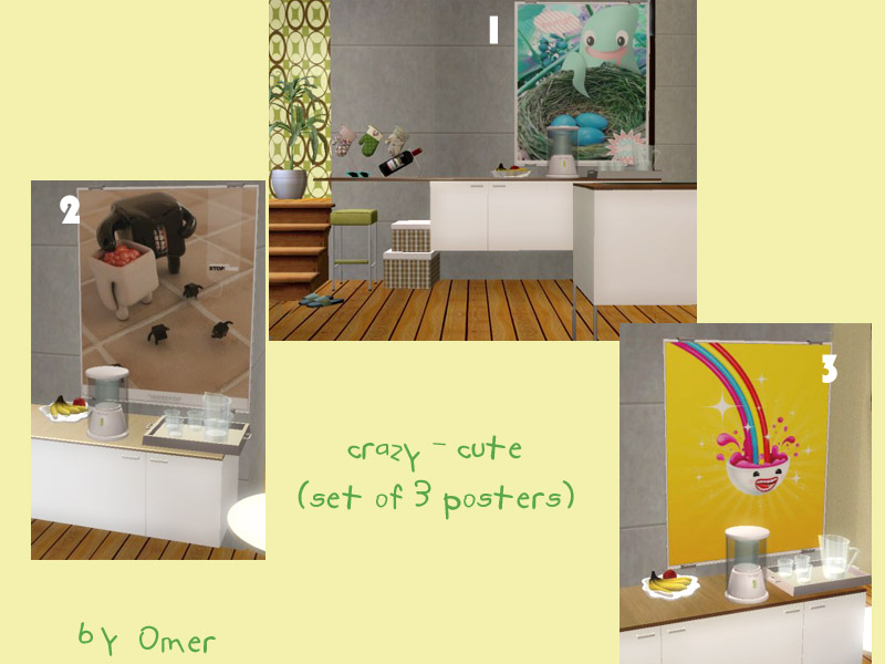 Three new posters for your kitchen spaces. Kinda funked up, J Art. The good thing about them is that they work for guys' as well as girls' homes. I absolutely have a blast pasting them on all my Sims' kitchen walls. Nightlife is required for these to show up. They are recolors of the Grilled Cheese poster base.