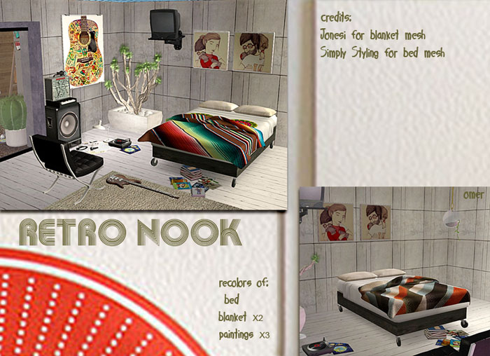 The set includes a recolor of Jope's bed [page 1] on simplystyling.de, two recolors of Jonesi's blanket, and three painitings on Nightlife bases [two on the small 'A Stroke' pink canvas, and one on the 'Grilled Cheese' base].