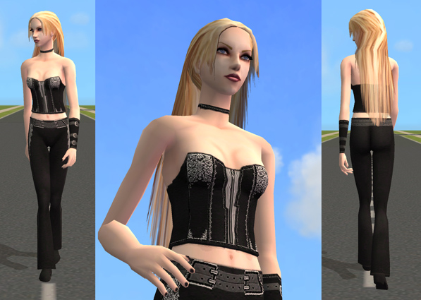 I know there are some UV problems on her chest, but for some reason SimPE is not working properly on my computer, maybe it’s Vista, who knows. Also, I do know that she’s suppose to wear high heeled boots, but again I really want to avoid as much custom mesh and any expansions as I can. Those things are just elements of complexity.