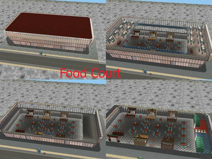 The food court is built on a 5x3 lot. There are food stands serving exotic foods from all over the Alpha Quadrant. (I'm working on a Klingon food stand, among my other projects. If it works, I might add a few different food stands)