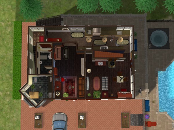 Outside is a lake, pool, hot tub, grove with fountains and flowers. After I broke my Seasons disk, I had to rebuild the house and chose a larger lot because I didn't like that there weren't trees outside the kitchen window. Now there are.