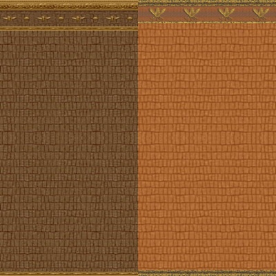 "Complicated Caiman" is a rich chocolate 'gator skin with matching crown molding and Napoleonic Bee motif. "Garish Gharial" is a more reddish-brown 'gator skin with matching crown molding with a wheat motif. "Blase Boa" and "Complicated Copperhead" are snakeskin patterns with matching wheat motif crown molding.