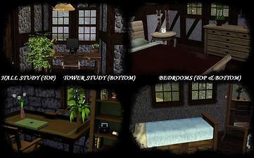 This is the fourth installment of my medieval series and it took a ridiculous amount of time to complete. The home consists of several buildings, The 2 Main Buildings (or one building since they're connected on the top floor) are home to the kitchen, dining room, 2 bedrooms, 3 full bathrooms, and a study area in the 2nd floor hallway. The tower houses another full bathroom on the ground floor and a study on the very top (no livable levels in between). The guards booth at the entrance consists of a spare or kids bedroom with 2 beds. The lower "dungeon" has a cell for your captives and a study area to keep the guard entertained (the cell serves no real function, it is soley for decoration, but if you can convince one of your neighbors to go in, you could remove the gate in buildmode and keep them as long as you'd like. But, don't forget to feed them). The entire home is surrounded by a stone wall for your magistrates protection. You don't want those pesky peasants getting in!