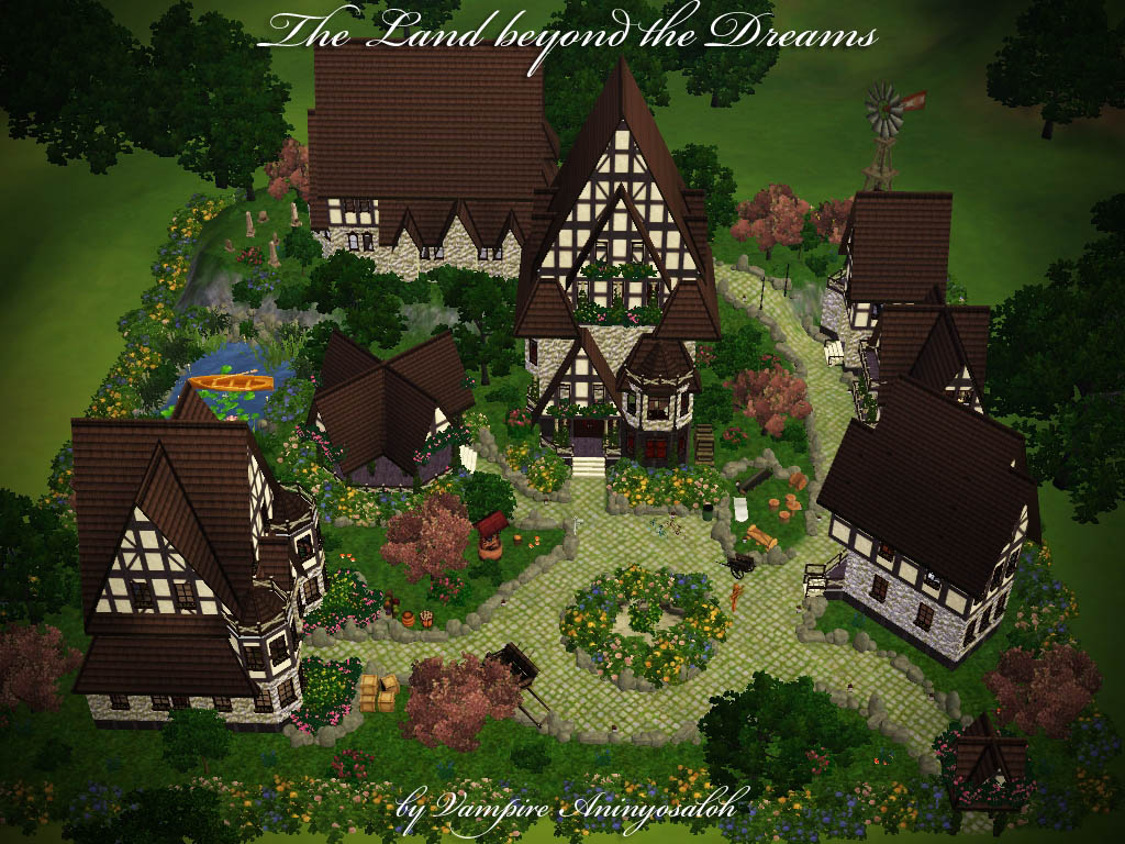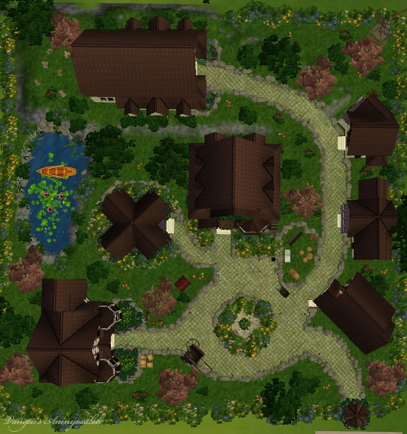 It's a fantasy town in the middle of the forest. It has a small square with a fountain and vegetation, an arbor, lots of stone paths to the different houses, a pond and a hill. The buildings are three small houses, a big manor, a tavern and a curch with graveyard.