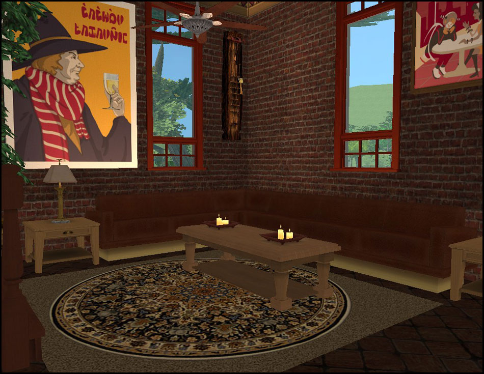 This is a bar/pool/poker place with a sunken karaoke lounge in back. It sits on a 2x3 lot with some room left for expansion if you want/need to expand it. It is fully furnished and decorated as elaborately as I get (which isn't terribly elaborate, I'm afraid), all in various shades of dark: dark wood, dark brick, and dark(ish) green and brown. There's a 6-seat mirrored bar. There's a unisex bathroom with three toilet stalls and a sink. (Because, really, Sims don't care if the bathrooms are gender-separated, do they? And it saves space. *laughs*) There's a pool table, two card tables, and two chess tables, plus the karaoke lounge in back. There's a front porch with seating that overlooks nice front plantings and a small rear porch with a dart board and some more seating. I've got the community-lot speakers in place, specifically the ones that play R&B because there are no jazz speakers (Why? WHY????!!!!), which is what I would have preferred. If that annoys you, take them out. I tend to like automatic music on community lots, myself. I don't really know why...