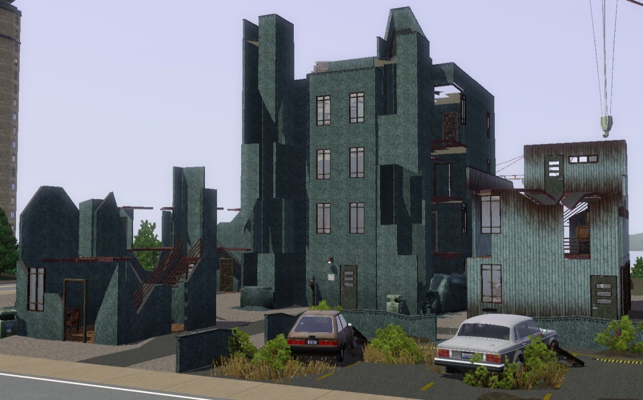 The main living area of this lot is the basement, unlike more traditional residential lots all the upper levels and out buildings are basically just decorative fluff designed to enhance the derelict / post apocalypse look, the pond outside can be fished in though it has no specific fish (it's only water spill where a fire hydrant burst after all