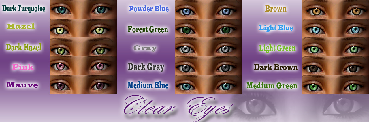 They're also available as default replacements if you want them to replace the original sim eye colours. The Dark brown from the eye set will replace the original brown, The Medium blue will replace the light blue, the dark turquoise will replace the dark blue, the gray will replace gray and the medium green will replace the green. Just download the rar "Clear_eyes_as_default_replacements" for them to work.