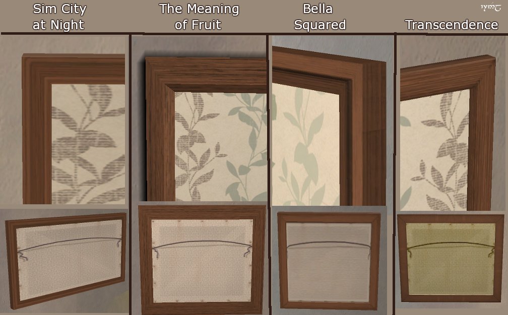 As you can see in most of the pictures I have attached, "The Meaning of Fruit" has a darker shadow than the other paintings. This is original to the game. However, in case you don't like it or just want things to match, I have "fixed" it (it wasn't really broken, just different) by pulling the shadows from another square painting ("Transcendence"). You will need to download that file separately in MeaningofFruit-lighterShadow.rar. (Only use one of my slaved versions of each painting, of course.) There is also a "fixed" package for the base game file--if you put it in your Downloads folder, your other "Meaning of Fruit" paintings in the game will have the same lighter shadow. (This gives it the custom content star, so be sure not to delete it from inside the game! If you don't want to take the chance you can try placing it in the relevant bin folder if you know how to do that.) One of the attached pictures illustrates the difference. All of the others show the Maxis original, darker-shadow version.
