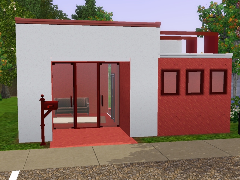 The house features what every starter home needs: a bedroom, a bathroom, a kitchen+dining area. The kitchen is functional--sims will use the corner-counter to prepare food.