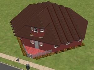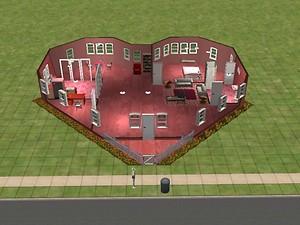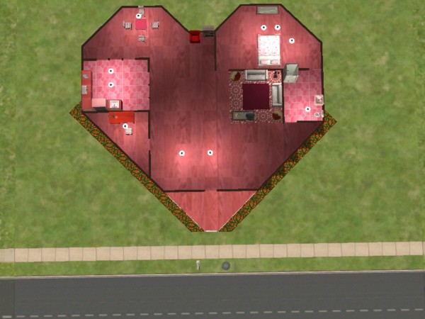 A small red heartshaped house, basically furnished. It costs only 19104 simoleons and would be perfect as a starter house of a young couple of lovers who can't just afford a more expensive one.