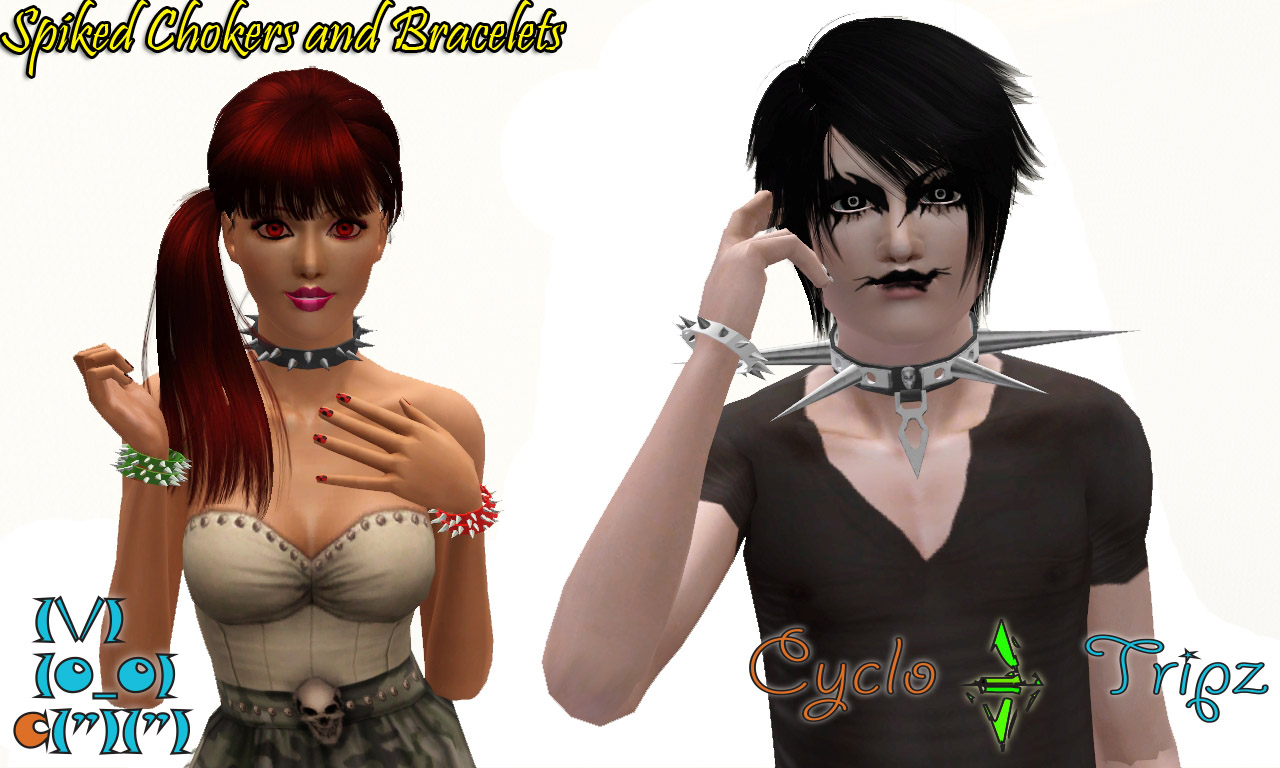 The spiked chokers also include male and female versions of three designs. The Single Spiked Choker has one row of spikes while the Double Spiked Choker has two rows of spikes. The Big Spiked Skull Choker has two large spikes, two medium spikes, metal plating, a skull, and a dagger attachment. The Single Spiked and Double Spiked Chokers have 2 recolorable areas: one for the collar and one for the spikes. The Big Spiked Skull Choker has 4 recoloarble areas: one for the metal plating and skull, one for the collar, one for the spikes, and one for the dagger attachment. The original skull mesh is by Matt Ostrom and can be downloaded here . I edited the original model heavily, from taking out the teeth and replacing it with a cover, to stretching the skull, and finally optimizing the entire model for Sims 3 integration (as well as attachment to the collar's base). Each spike is fully meshed as well as the metal plating on the Big Spiked Skull Choker.