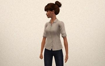 Eva is pictured wearing this shirt from the Store: Blouse with Rounded Collar , Gerations Jeans, Base Game Flats, and Base Game lipstick.