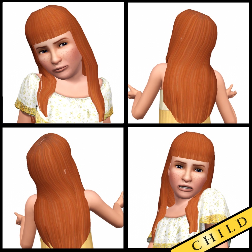 The most substantial change was making this style available for children and toddlers. I made a special effort to be sure that the hair bones were properly set for your little ones, so you won't have to deal with "seesaw" hair or a pointy, stabby mesh. The front tendrils "hang" a little on a crawling toddler, for a bit of realism. I have noticed a bit of clipping in the back due to the three-layered ends, but it's minimal, and not a continuous issue.