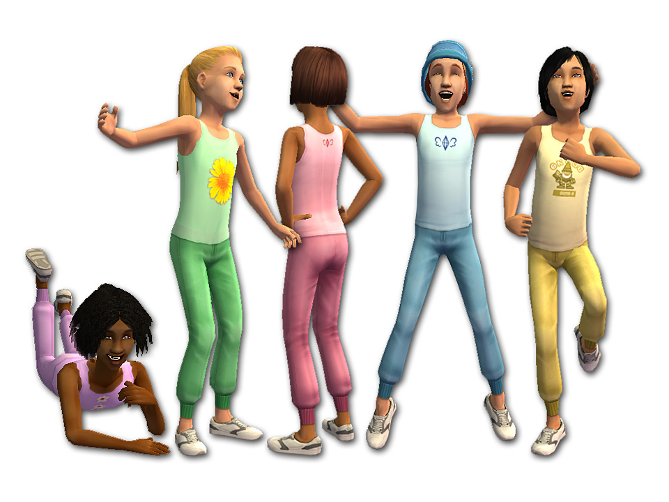 I've set these outfits as Athletic and Everyday (just in case your Sims want to wear their sporty duds to school). They use a new mesh (included in the zip file) and have a working fat morph; see if you can figure out which Sim needs to do a little more exercise! No EPs or SPs are required.