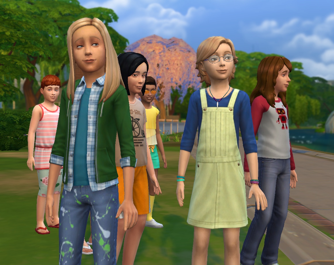 These are CASP overrides -- no mesh or textures included, they reference what is already in everyone's game and are thus very lightweight (2-3 kB each). In the zip are separate packages for each hairstyle, please refer to the screenshots to see which is which (Edit -- just noticed I got one of the names wrong, the boy with the red/white robot shirt is wearing PonyMidWavyBangs, not LongStraight). All of these are available for townies as well.