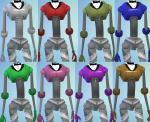Each of the 13 parts comes in 10 colour schemes: 1) Grey/Silver, 2) Black/Grey, 3) Red, 4) Bright Green, 5) Blue, 6) Purple, 7) Pink, 8) Brown/Gold, 9) Olive Green, and 10) Rusty. Below are examples of Pink, Bright Green, and Black/Grey. These sims are wearing matching colours but you can of course mix parts of different colours on the same sim. Please see the above row of pics to see all the parts in all the colours.