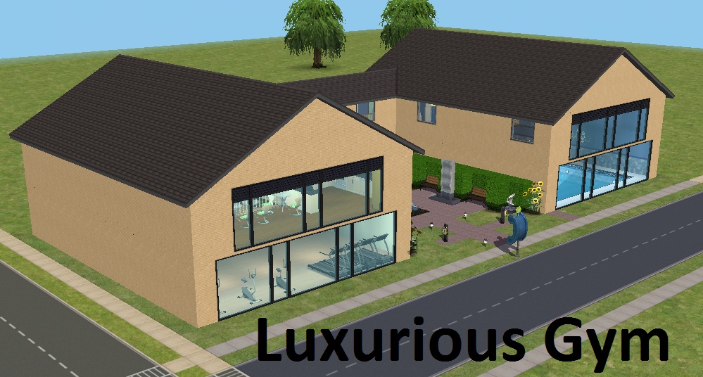 The idea behind this gym is for Sims to show off while they work out. Or spy at all the people passing by, your call how you interpret it. I wanted a sort of combined gym/spa, so there is one area devoted to working out, and one with a pool and hot tubs. There's also a kitchen where you can grab food or coffee, and a changing area. The entrance is intended to be calm and fresh, to get you in the right mood before you enter.