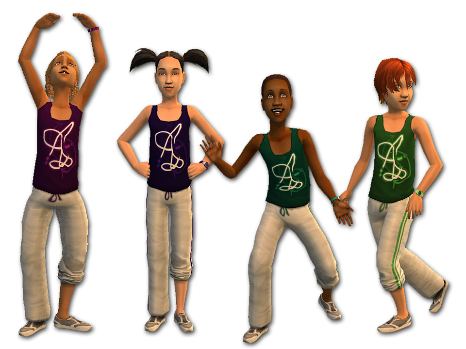 These exercise outfits use a new mesh, which is included. The mesh has a working fat morph (see the blond girl twirling on her rollerskates, above). All ten colours (berry, grey, yellow, brown, red, green, violet, blue, indigo, and teal) are unisex, and can be worn by both boys and girls. They're set as Everyday and Athletic. No EPs or SPs are required.
