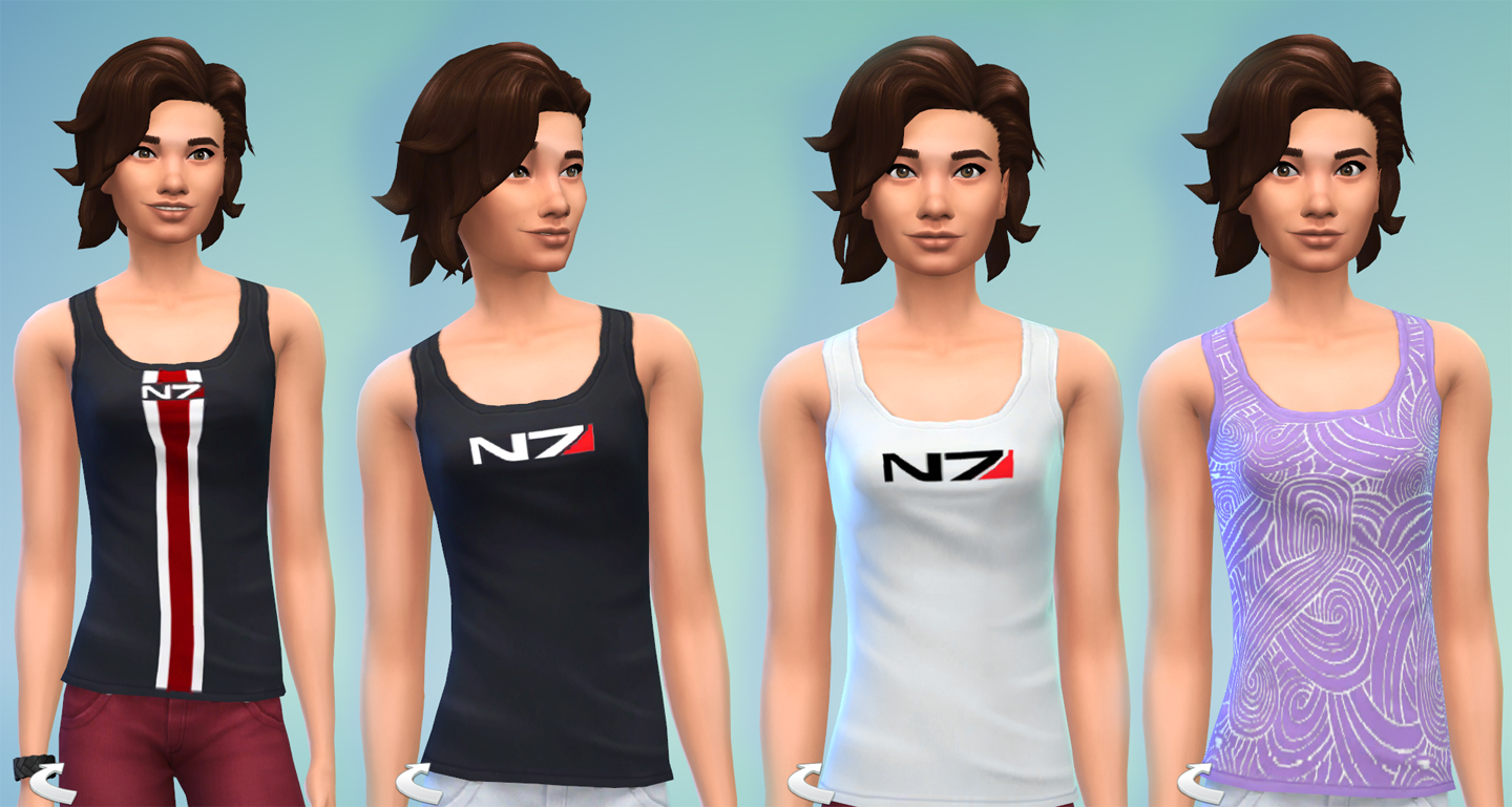 Some Mass Effect tank tops for your male and female sims based on BioWare store items so now your sims can go save the universe too. For guy and girls there's N7 tank tops, basically one tank top with 3 presets and for girls there's also a Tali tank top.