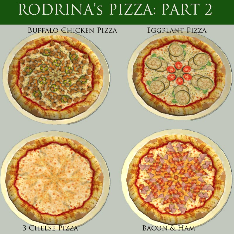 This time around, I've made Buffalo Chicken Pizza, Eggplant Pizza, 3 Cheese Pizza, and Bacon & Ham pizza. Yet again, these pizzas were cloned from toastee pastries and they work well. You will find these pizzas in the "Serve Rodrina's Pizza" or "Have Rodrina's Pizza" tabs of the fridge.