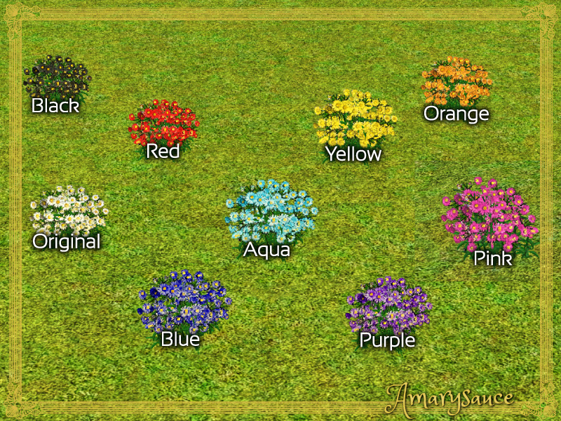 Here we have daisy plants, in orange, yellow, aqua, blue, purple, pink, black, and red, with the original white for comparison.
