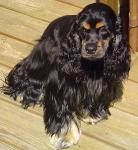Scooter, the black and tan cocker has the following traits: hunter, friendly and noisy