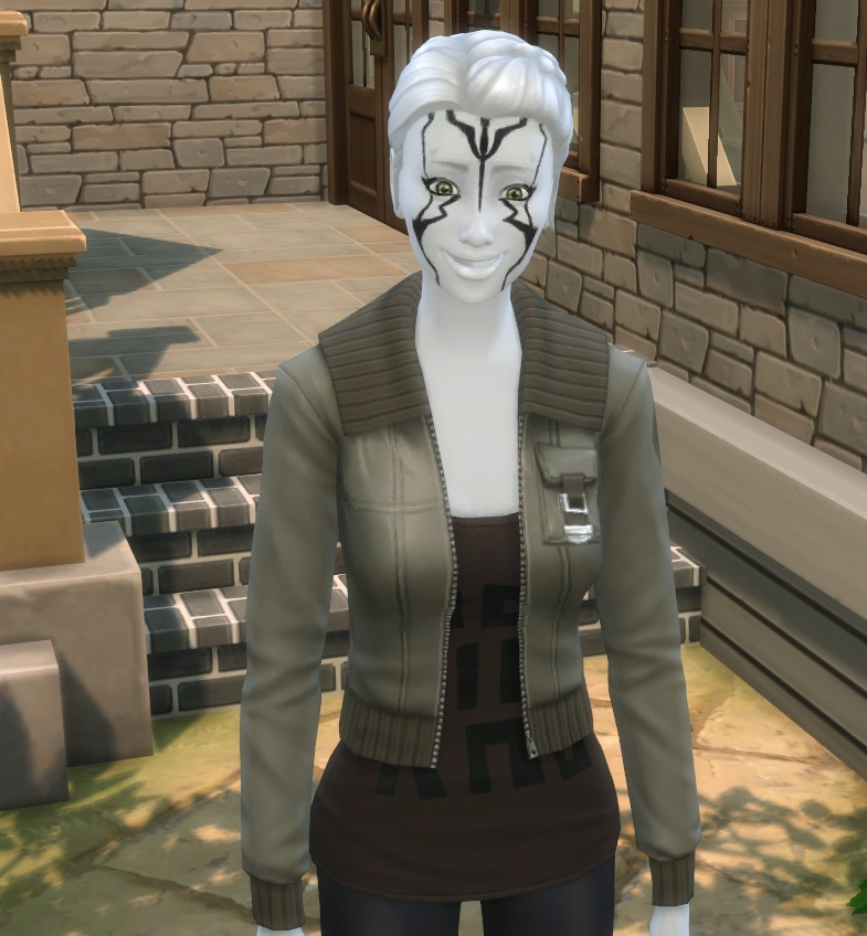 Jaylah is a new character introduced in the 3rd installment of the rebooted Star Trek movies, Star Trek Beyond. Jaylah helps save the crew and befriends them, and ultimately is one of the most charming new characters I've ever seen. I absolutely adore her so I had to make this CC skin and eye package! Nothing is known about the name or origin of Jaylah's species, so sorry I can't elaborate! Distinct features are the white skin with these beautiful markings and bright yellow eyes. I painted the markings on a white female mannequin model from the Get to Work expansion pack using Photoshop and just recoloured some eyes using Photoshop again.
