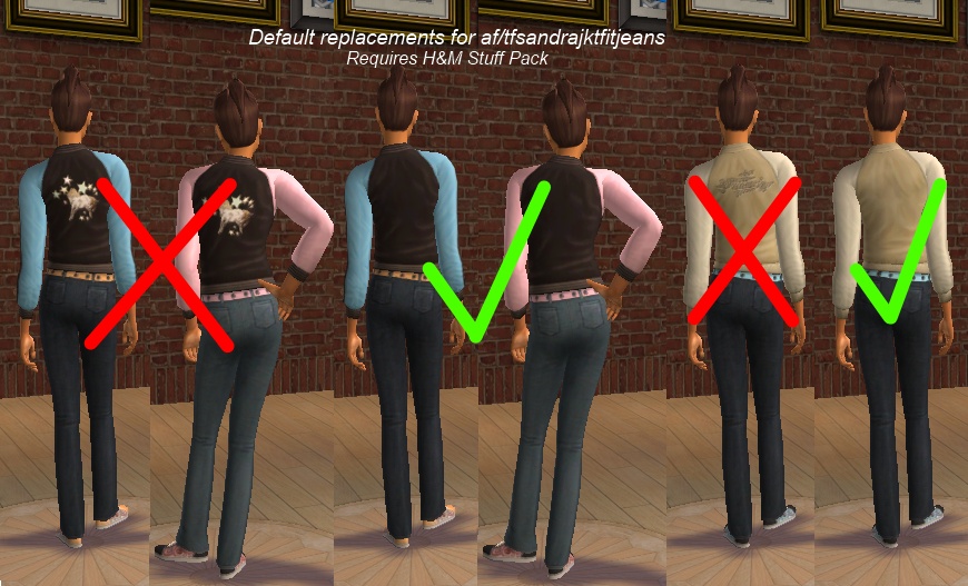 Anyway, I was able to take the blank backs and apply them to the Maxis textures, and turn them into default replacements for af/tfbodysandrajktfitjeans. With Phaenoh's permission, I also did this for the textures in her default replacement for these outfits, so you can have both design-free backs and an undershirt underneath the jacket. Because the brown jacket has a different design, replacement packages for it are separate from those for the blue and pink jackets. Since they replace an outfit from H&M Stuff, H&M Stuff is required.