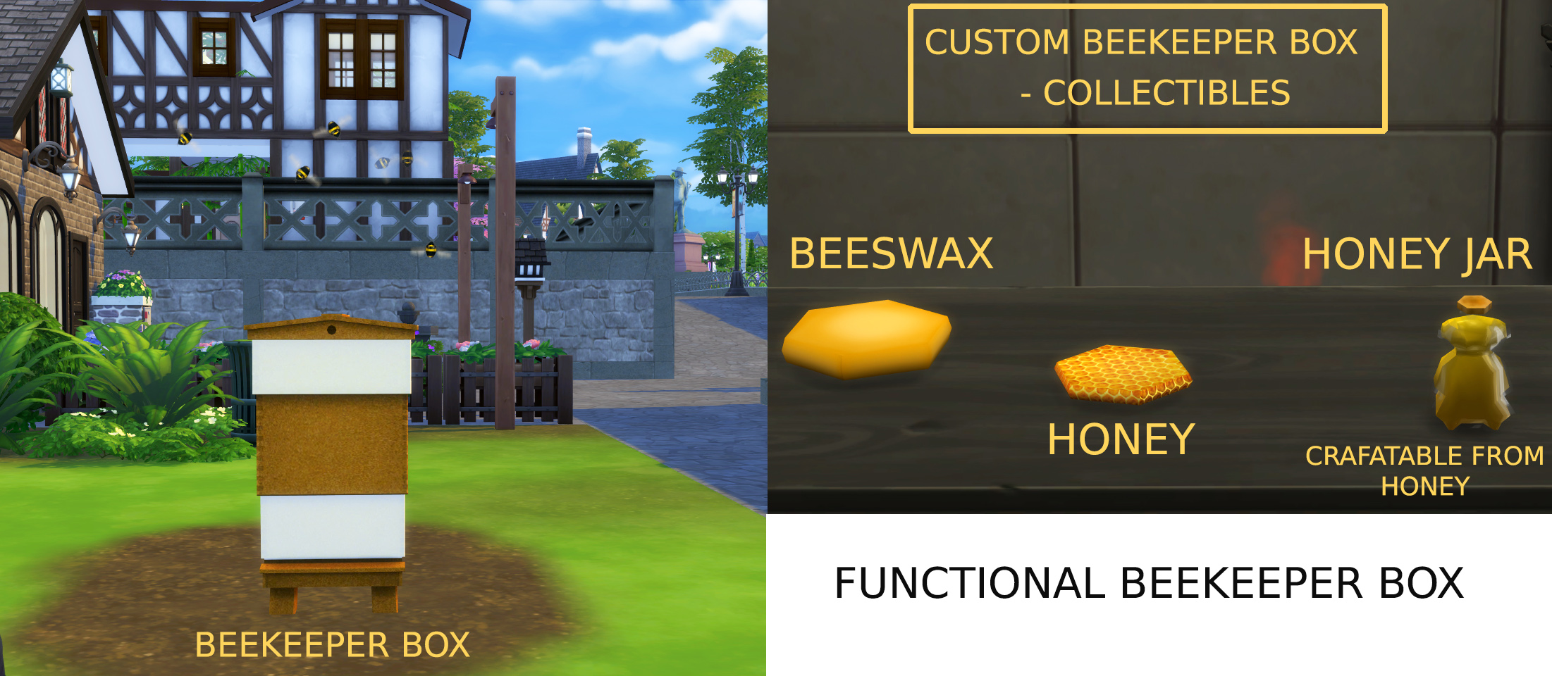I always loved the Beekeeper box from Sims 3 supernatural , so I decided to make something similar for sims 4 complete with swarming bees.This will be a nice addition for all the homegrown gardeners and farmers out there!