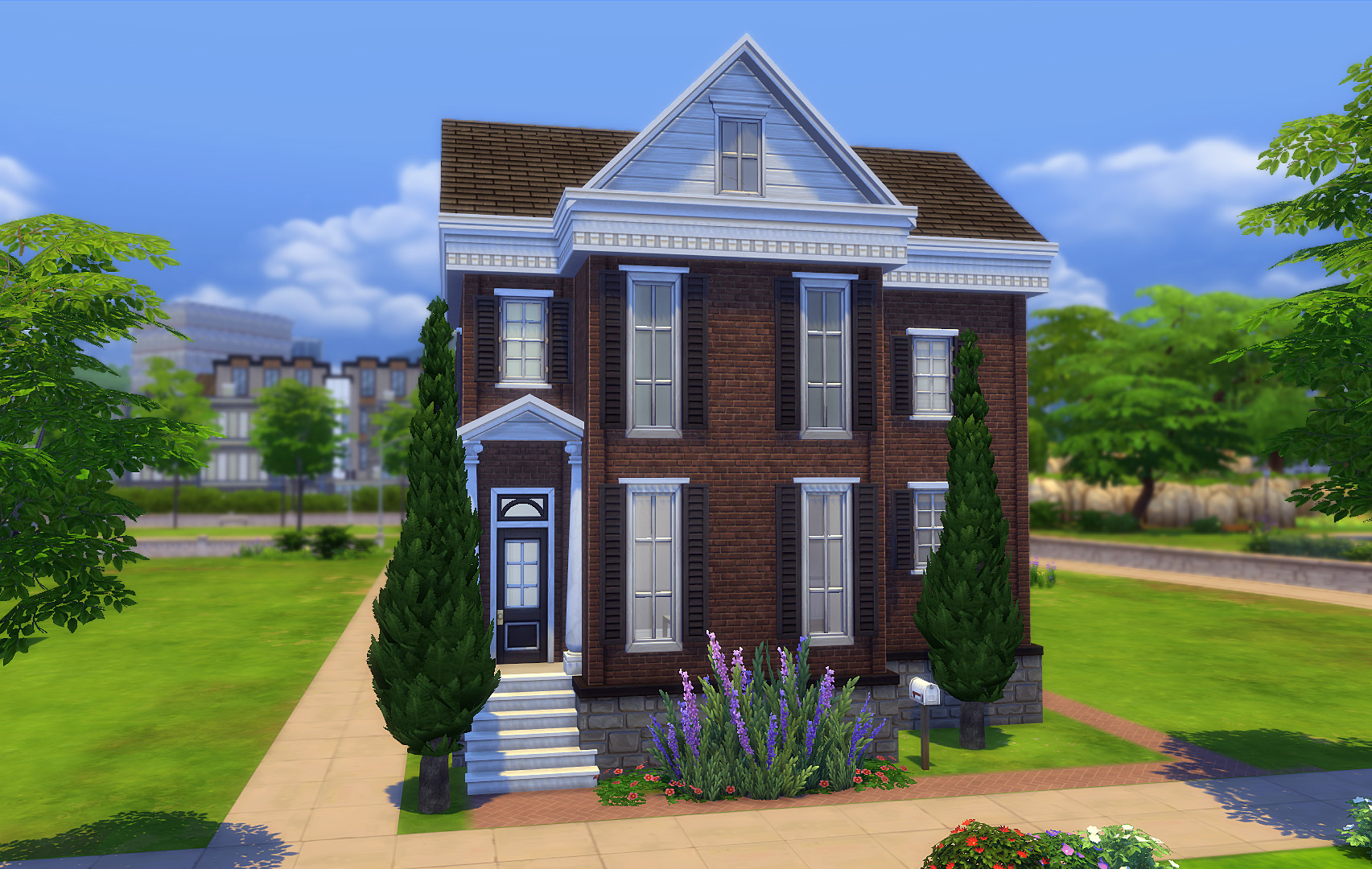 a neoclassical townhouse on a tiny lot - can sleep 6+ sims, or more with single beds, with a tiny bit of backyard to play in. comes with the basics, plus fireplace and bookshelf.