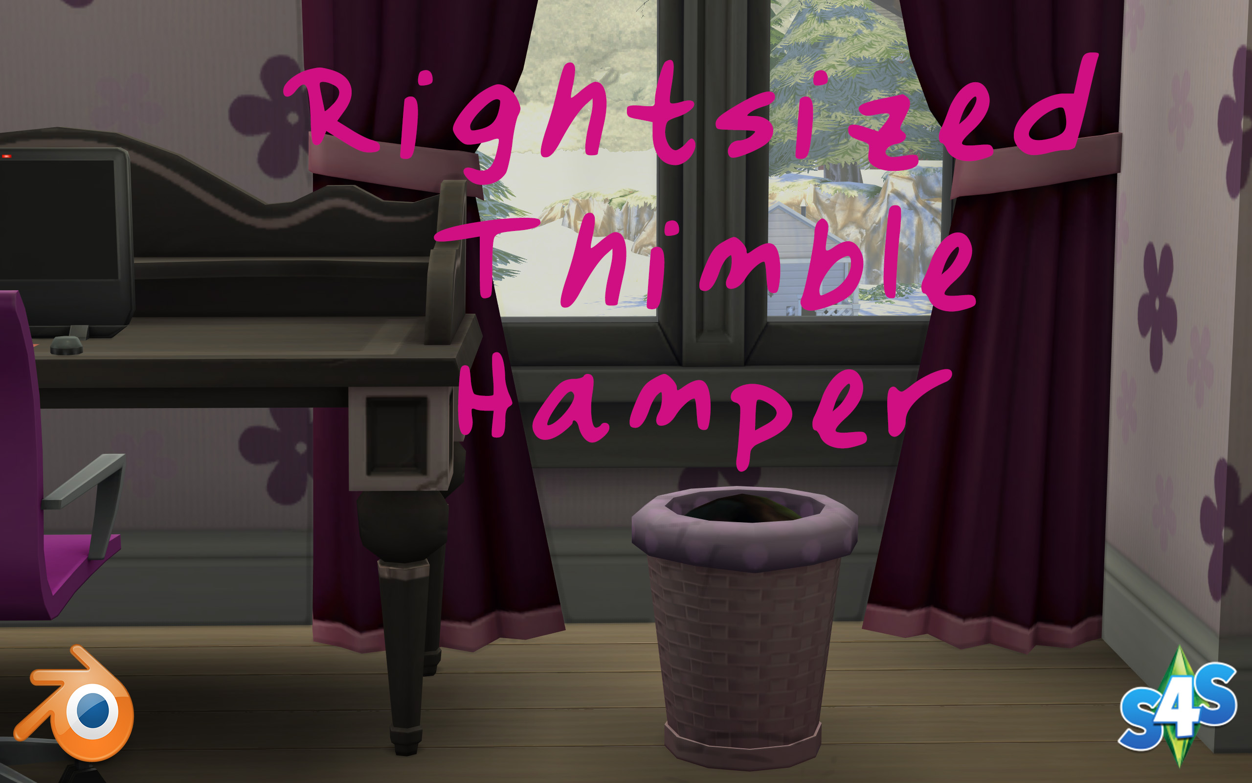 This is the second hamper in my Laundry Day Stuff conversion collection. I really like the garbage can that came with the Kids’ Stuff Pack, but I’ve always thought that it looked more like a hamper than a garbage can. So once I figured out how to turn “fake” hampers into real hampers, my next task was to turn trash cans into…umm…treasure…er…laundry baskets. So after taking a crash course in Blender, I present the Simmer community with the Rightsized Thimble Hamper.