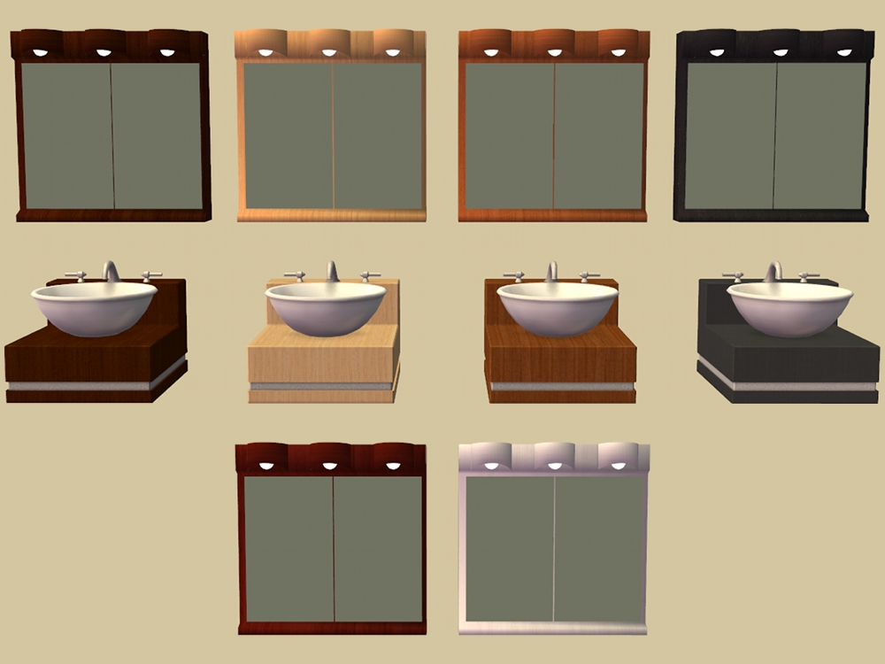 SnowStorm's Medicine Cabinet with Mirror & Lights in AL Wood, LACK, and MALM colours. Black, Steel and White to match my Base Game Bathroom Objects in Black, Steel and White. I also added colours to match the Kitchen & Bathroom stylish and romantic sinks.