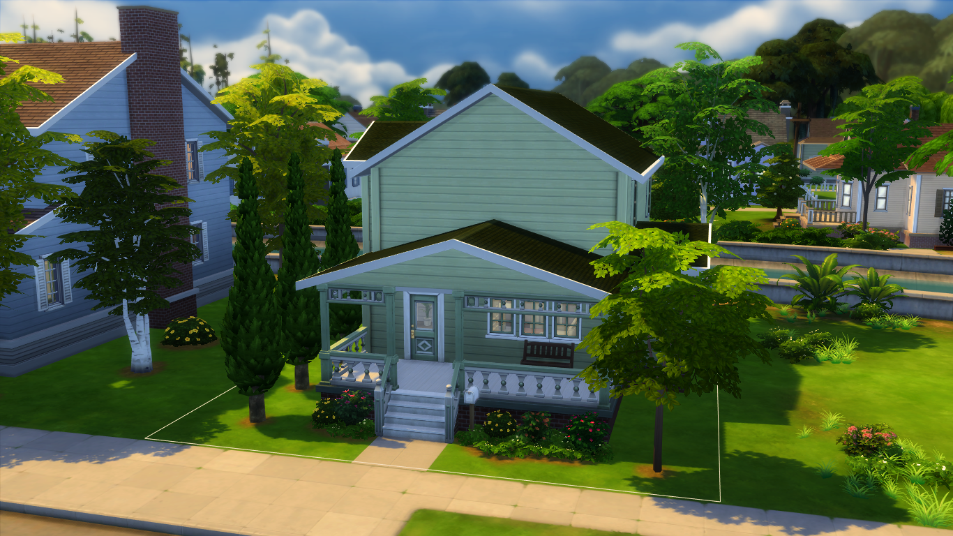 This one was built for a couple of Sims with two kids/teens. Originally it had only one floor, but I decided to move the bedrooms (that actually was only one, and now are three) upstairs. The outside hasn't changed much and I kept the colors and the style to match the others neighbours' houses.