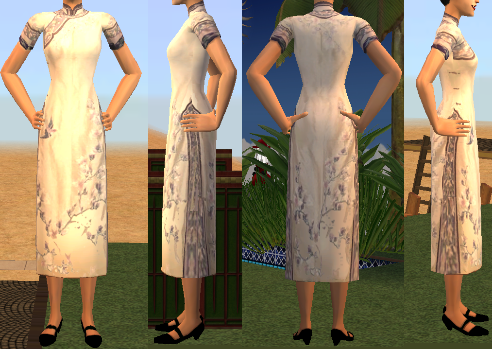 I created Chinese dresses inspired by 1910s women's fashion in China. I used the maxis base game "momdress" full body mesh for them.