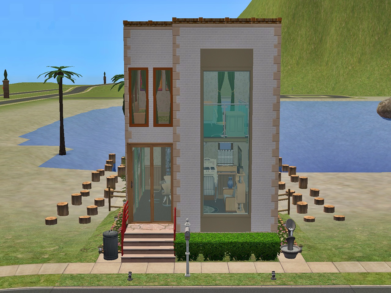 the external part is adorned with plants and a fountain. access to the beach is fenced and therefore the sims enter through the backyard of the house where there is also a chess table.