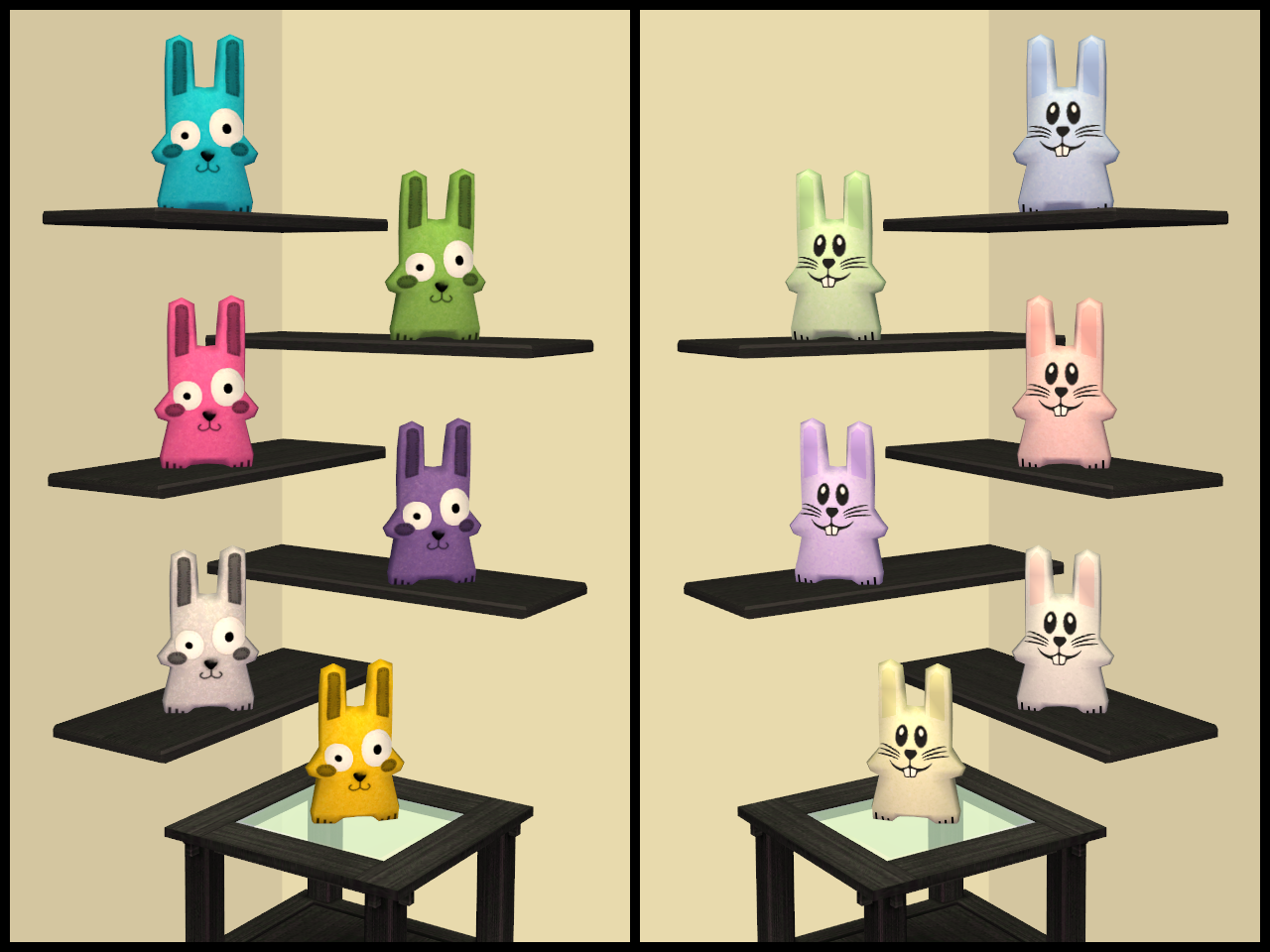 he84 asked for the LACK recolours and larger Freezer Bunny. Thought I would add GOTH, Metal and Pastel colours as well. I put a different face on the pastel Freezer Bunnies to make it friendlier for your little Sim's nursery.
