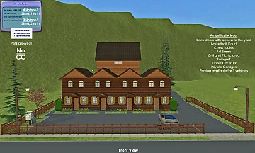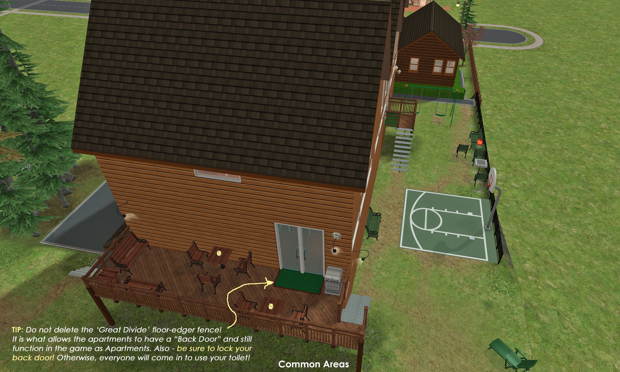 There is parking for three "community" vehicles on the driveway spaces at the front of the complex. These cars must be placed before moving any sim onto the lot. The cars will be community property - usable by any and all residents. In addition, the three back apartments come with private garages.