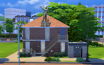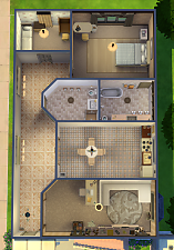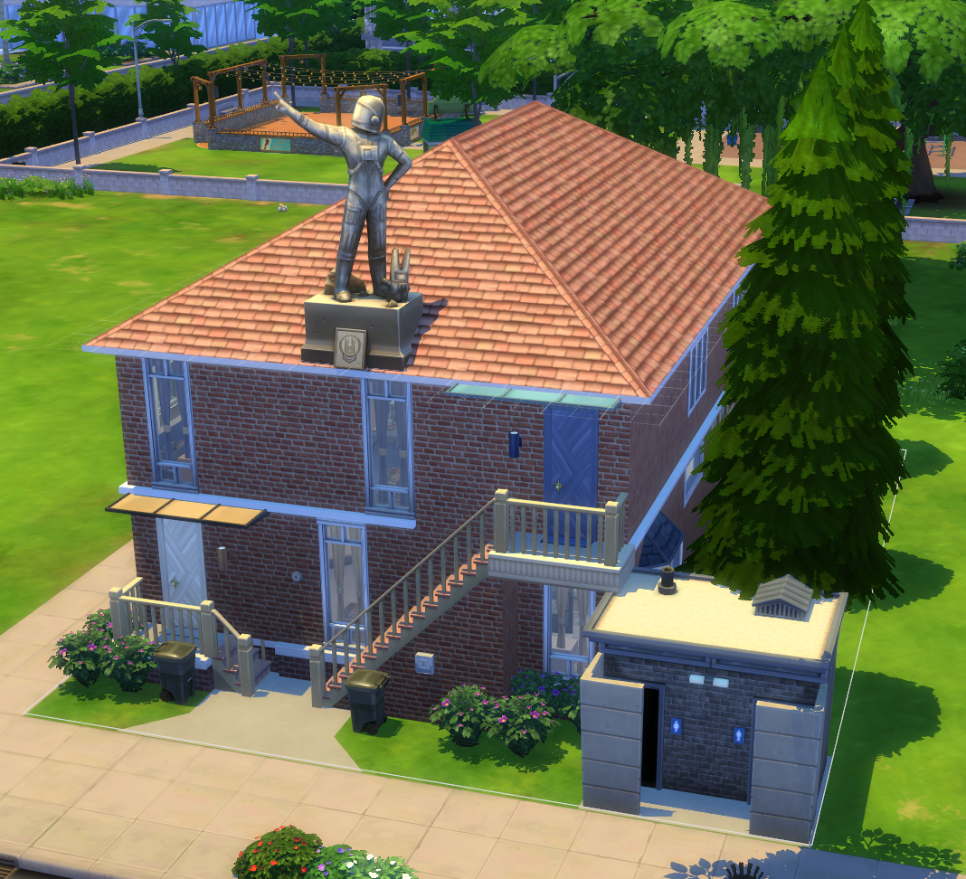 I came in quite a bit under budget, too, with 78,370 being the fully furnished-and-cluttered price. A master and kid's bedroom, a master bath and family bath (with, of course, an adult toilet and three toddler toilets in each, because the challenge never said I couldn't use toddler toilets) that contain a little easter egg having to do with the owner being an astronaut, a kitchen/dining, and a living room with desk and computer, all included in each "duplex" floor. You will need MoveObjects on, mostly for the outhouse. The mailbox is an apartment mailbox, situated outside along the staircase, and the thermostat is also outside so that no matter which "apartment" you choose, you can have access to it.