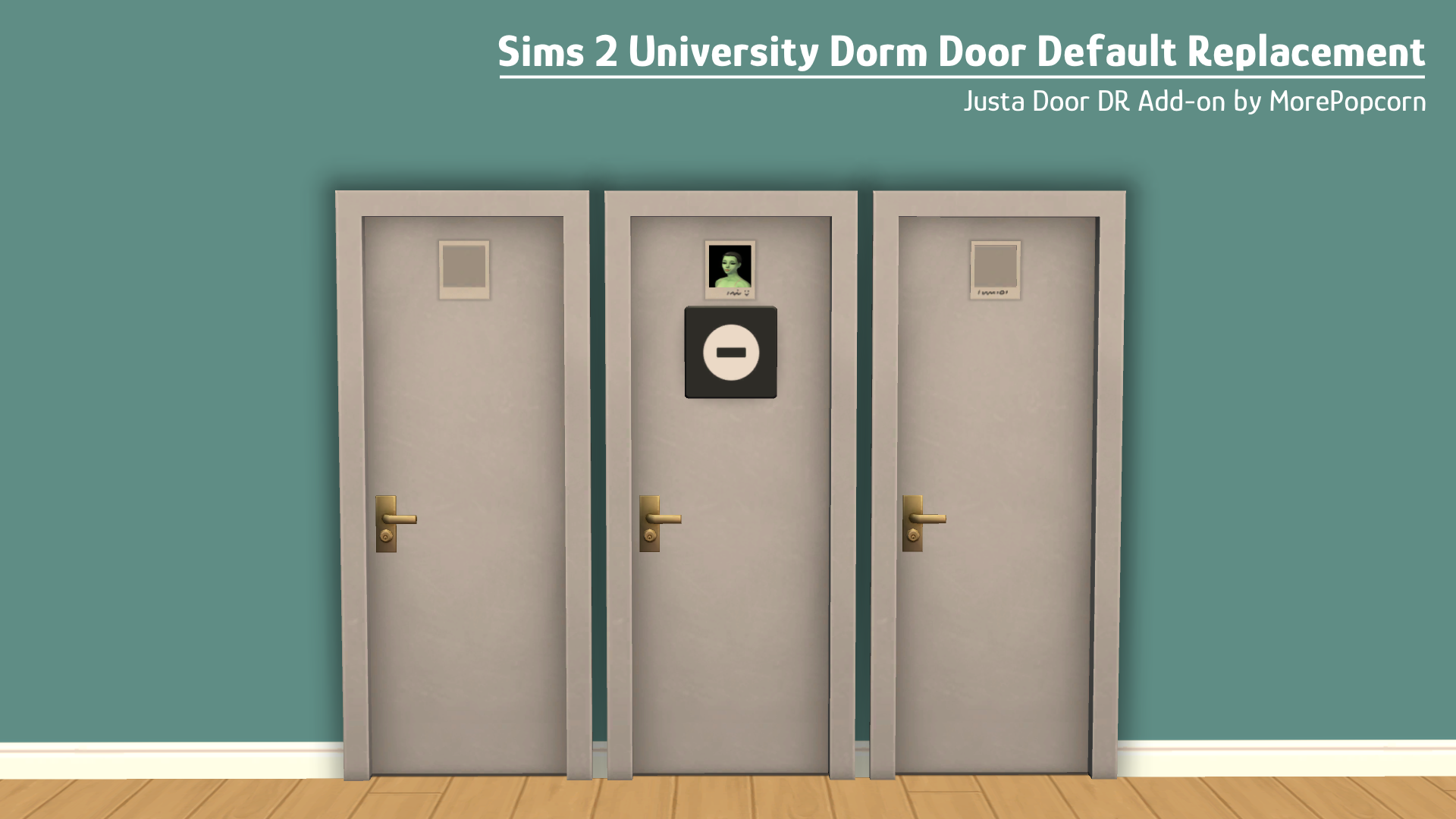 It has no posters on the back. Instead, you can recolour the photo stuck onto the front of the door to either a blank, a text scribble, or a scribble with a smiley face. I converted the photo 'frame' from Ravasheen's Photographic Memory mod for The Sims 4. The photo is smaller than the one on the original door, but still big enough that you can tell who occupies each room.