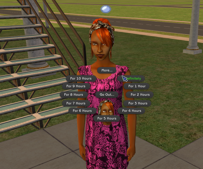 However, if you play with Chris Hatch's "Visit Sims" mod which enables sims to visit other residential lots, a pregnant sim's pregnancy timer WILL continue to progress while they are visiting. When they return home and you send them to "Go Out", you may want to pause their Pregnancy. I have therefore made an alternative version of the mod which gives you a pop-up similar to the Young Adult's popup, asking if you'd like to pause the pregnancy or not.