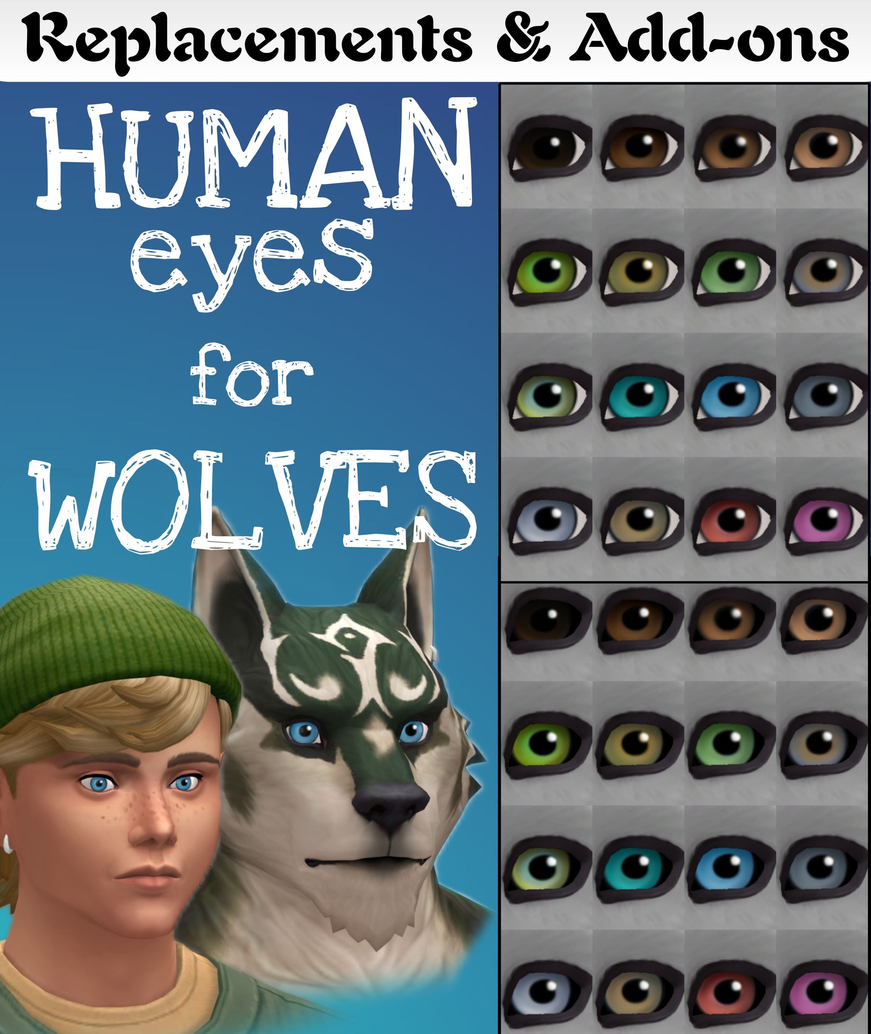 My brain wouldn't stop bothering me with this until I did something myself. So I took the human eye textures, edited them respectively and made them fit for werewolves. I also only used 16 swatches from the 18 available ones because I skipped one green and a blue swatch since they look identical to the other green and blue one anyway.