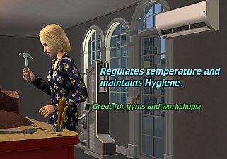 The revised air conditioners work like the original - they regulate temperature of Sims in the room. But now, they all have limited range, have proper placement, maintain Hygiene instead of Comfort (trust me, I'm a Southeast Asian), and have selectable modes with different magnitudes of cooling (or heating) and target temperature. Each model also comes with its own quality and catalog description.