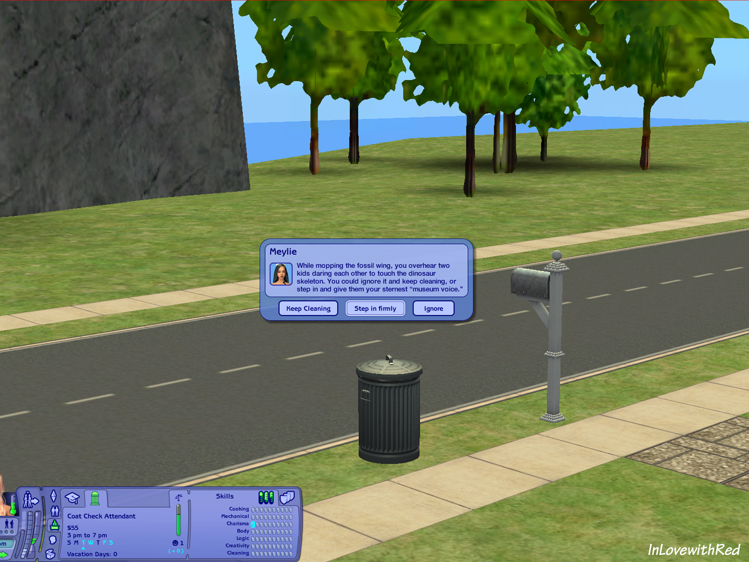 Level 1: While mopping the fossil wing, you overhear two kids daring each other to touch the dinosaur skeleton. You could ignore it and keep cleaning, or step in and give them your sternest "museum voice."