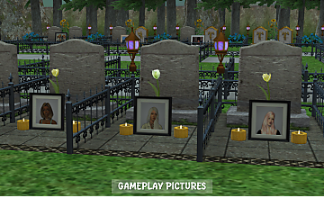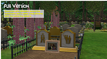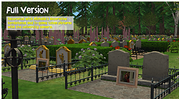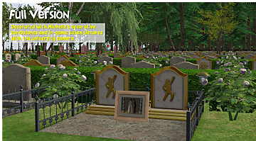 - Full Version: Same as the empty version, plus Michelle's decorative tombstones put in place to simulate a completely populated cemetery. This version also contains pictures of couples of sims to represent those who have passed. These pictures were taken in-game with the university camera and placed in the four-tile plots. This version includes the following custom content:
