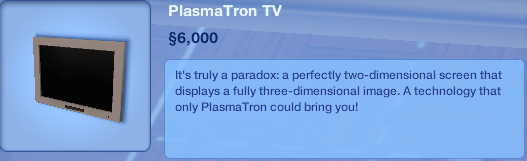 Explanation: After having some trouble with this specific TV which you can purchase in The Sims 3 Store separately or in combination with the Full Bayside Set, I found out (more on accident than anything) that it displays the exact same name and description as a TV that is contained in the base game. After further researching, I noticed that the PlasmaTron TV uses the same IDs and name as that particular base game TV, called "ÜberVision Panoramic from Landgrabb Industries". That's why it shows the same name and description when viewed in Buy Mode. And this cannot simply be fixed by changing text, because it would change the description for the base game TV as well. So I created two new random IDs (which hopefully are not in use anywhere else) and used them to link the PlasmaTron TV to the correct text resources. I edited all language resources, but I haven't tested it for all of them, so hopefully it will work for any language version, but if not, feel free to let me know and I'll take a more precise look at the specific language. I also created a decrapified version for people who have a decrapified variant of the TV.